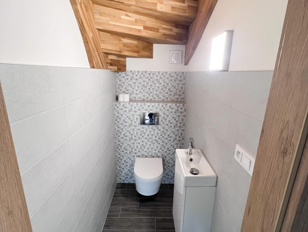 Pro založení stavby ve svahu jsme vypracovali individuální projekt, který zaručil naprostou bezpečnost a stabilitu konstrukce. Harmonogram prací jsme naplánovali do nejmenšího detailu, což umožnilo bezproblémovou koordinaci, včetně montáže schodiště a následné instalace toalety. Pro vytápění a ohřev vody jsme zvolili moderní a úsporné tepelné čerpadlo vzduch/voda v kombinaci s podlahovým vytápěním. Toto řešení zajišťuje nízké provozní náklady a vysoký tepelný komfort po celý rok. Během celé stavby jsme s klienty aktivně komunikovali, rozptylovali jejich obavy a informovali je o každém kroku.