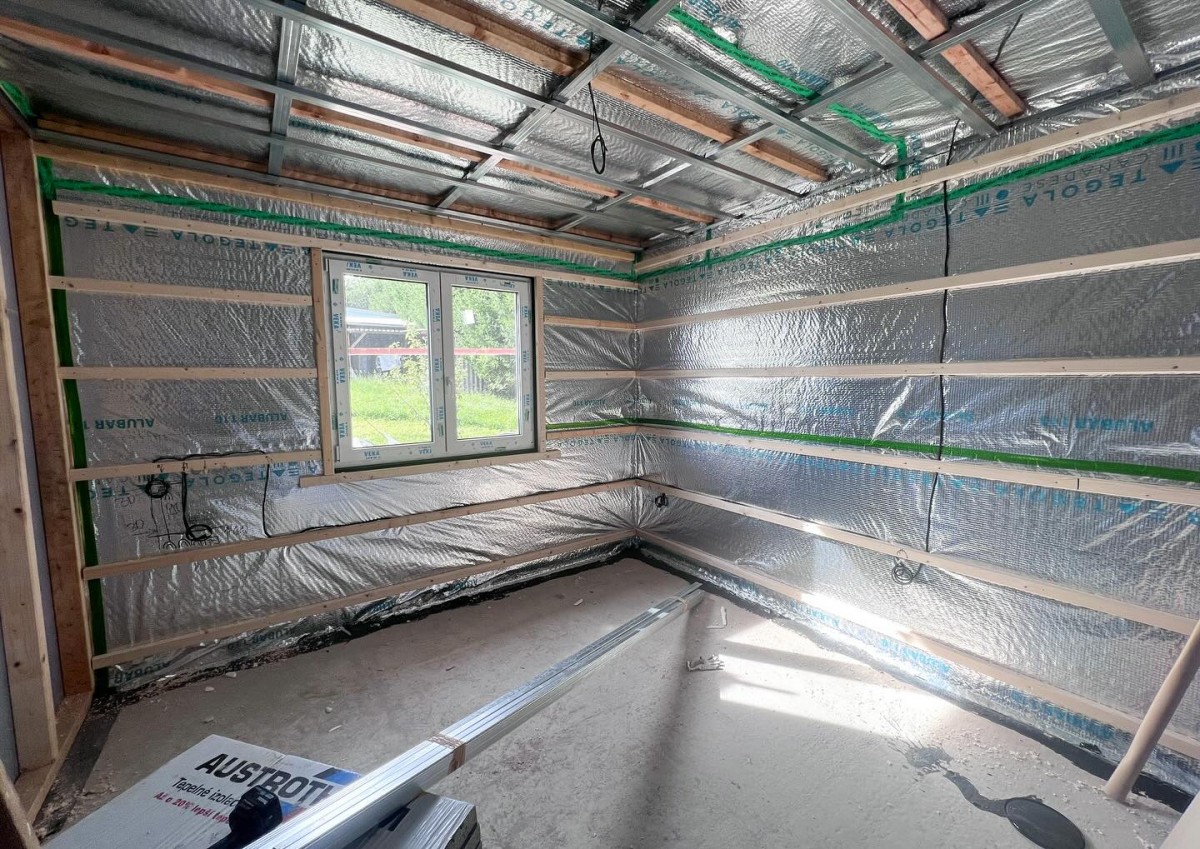 Stěny a strop jsme izolovali stříkanou pěnou, která vytváří dokonalou tepelnou izolaci domu a minimalizuje energetické ztráty. Dohodli jsme se, že si klienti zhotoví základovou desku svépomocí, k níž od nás zdarma obdrželi kompletní projektovou dokumentaci. Tento krok nejen ušetřil náklady, ale také posílil vzájemnou důvěru.